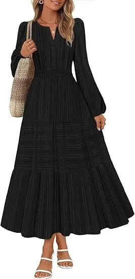 Step into refined elegance with this Princess-Style V-Neck Dress, designed with a graceful mid-calf length and a slim-fit silhouette that beautifully enhances your natural shape. The long sleeves and soft drape create a timeless, feminine look inspired by European and American fashion.