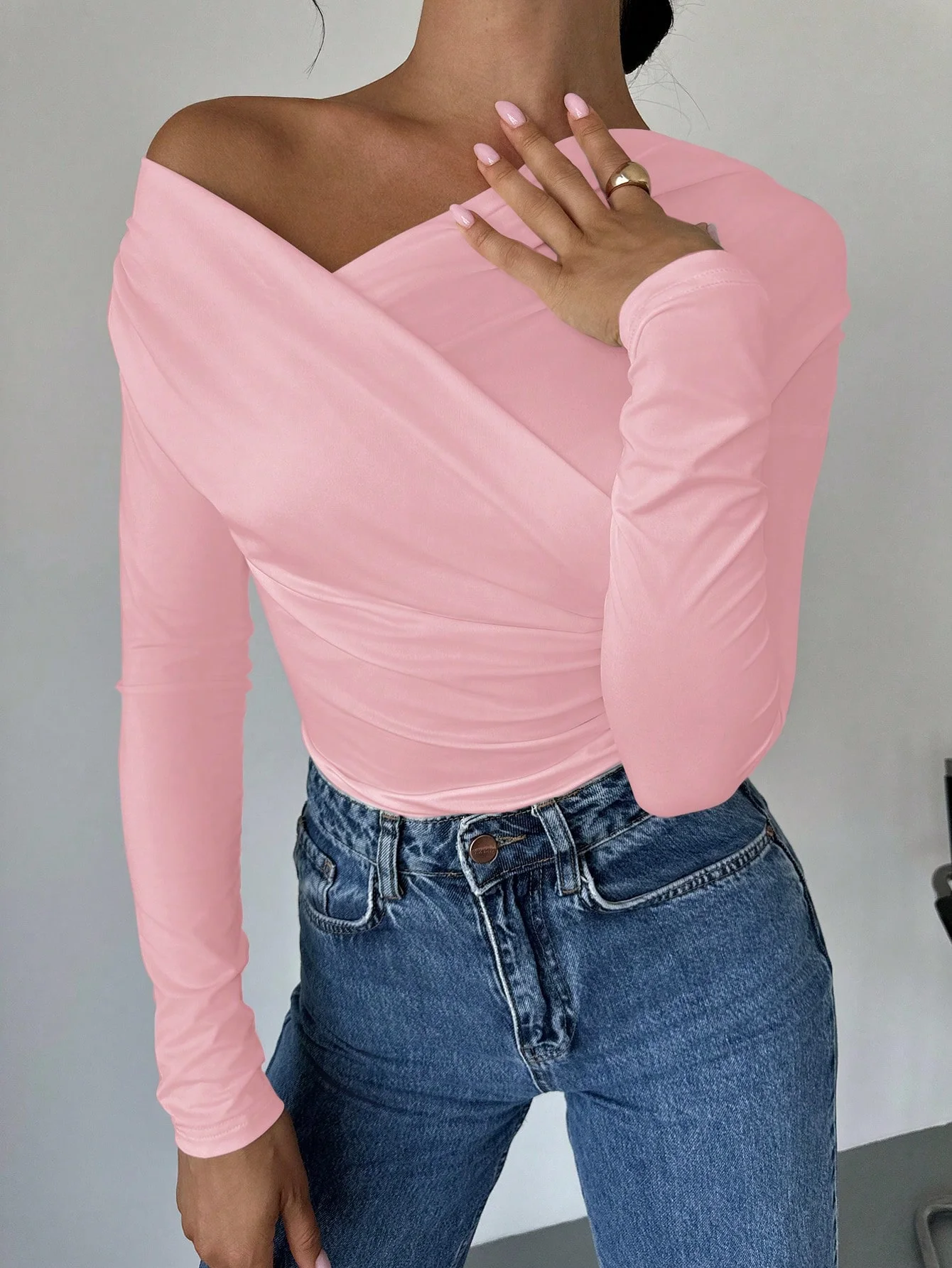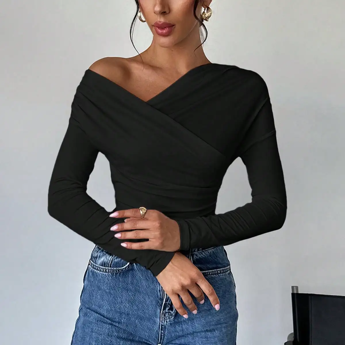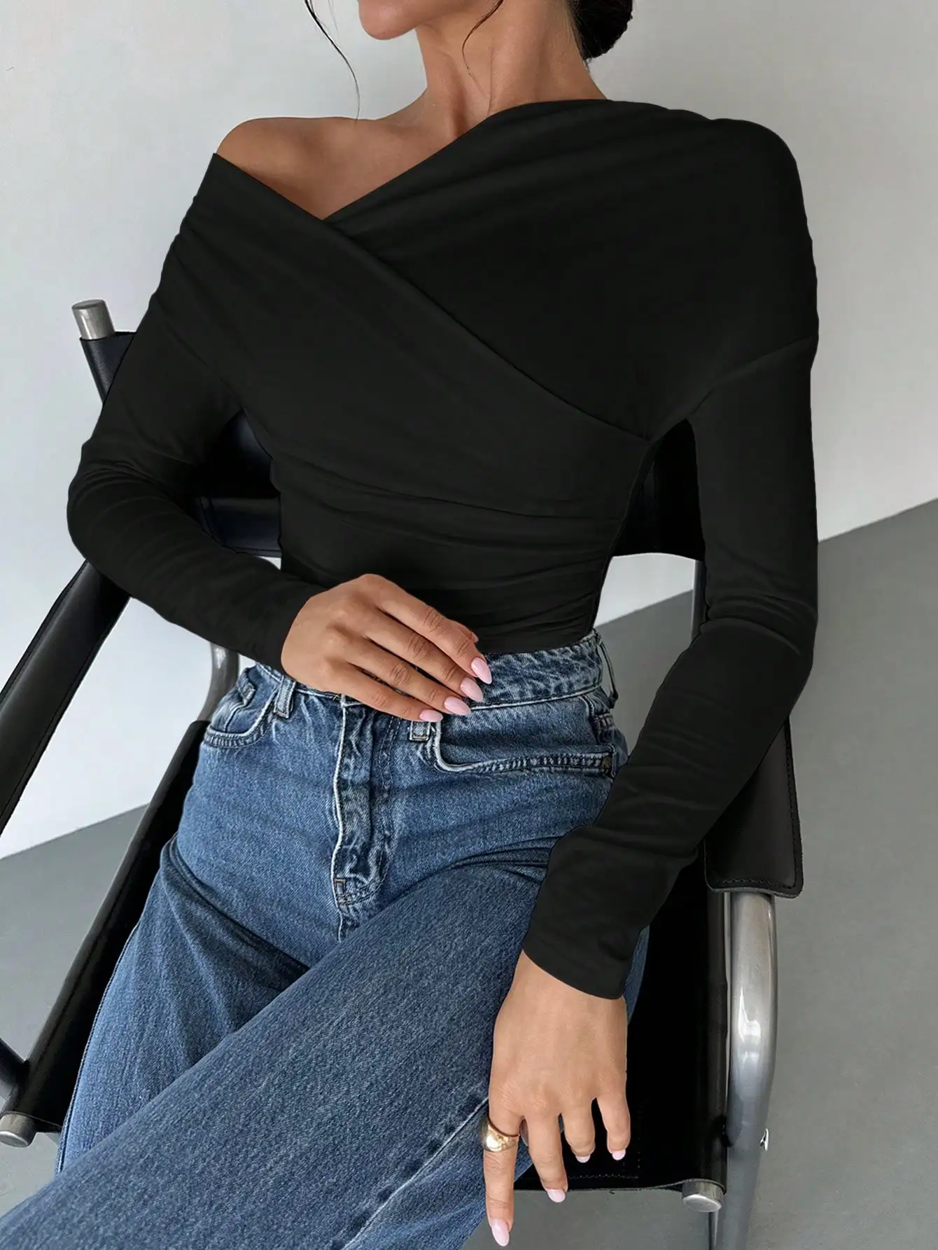 Off-Shoulder Asymmetrical Long Sleeve Top – Slim Fit European Style Jersey Base T-Shirt for Women