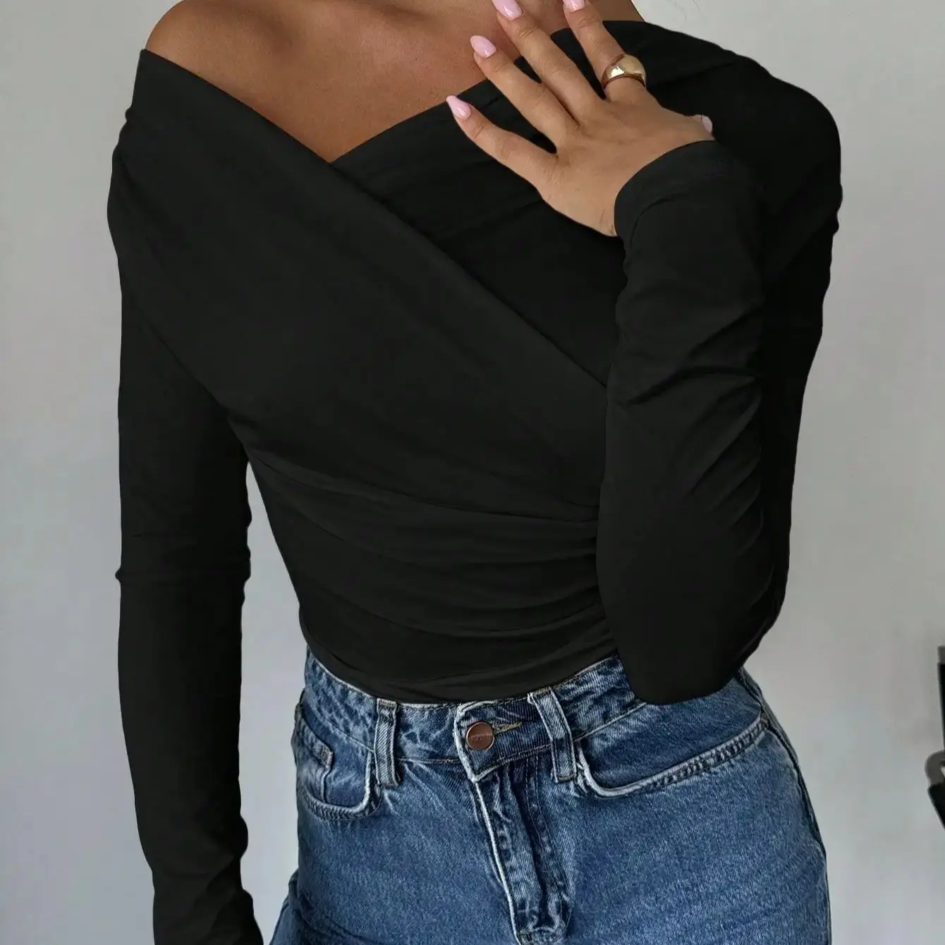 Effortlessly chic and subtly sexy, this off-shoulder asymmetrical long sleeve top is a modern wardrobe essential. Designed with a sleek European-inspired silhouette, it features a flattering neckline, soft stretch jersey fabric, and a slim fit that hugs the body comfortably.