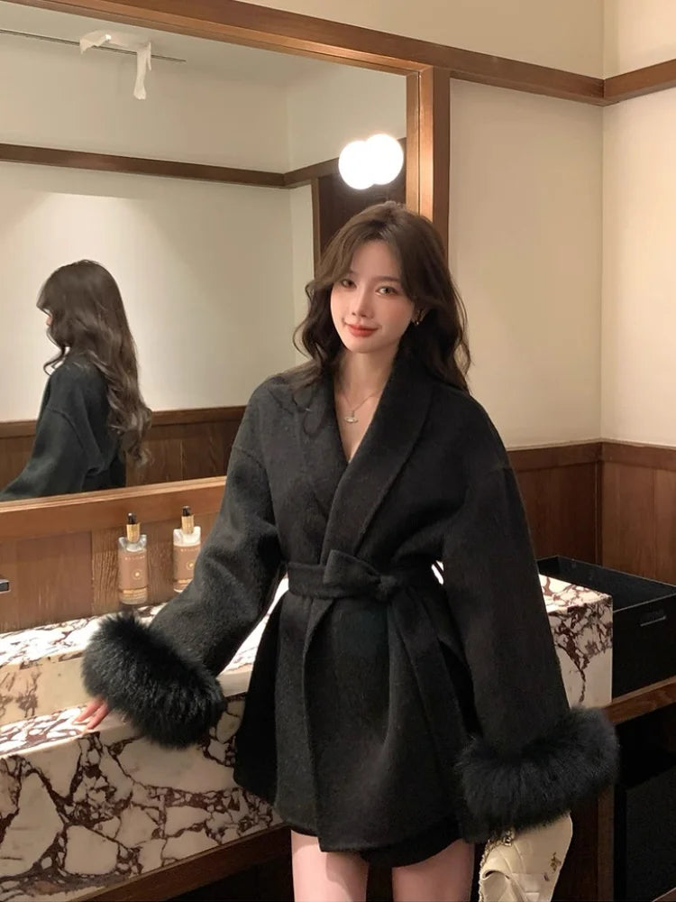 Elegant Lace-Up Woolen Coat for Women – Furry Lapel Patchwork